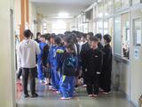 体育館において、中学生としての身だしなみについてや通学方法、部活動についてのガイダンスを聴きました。生徒会役員の生徒たちが分かりやすく説明してくれ、新入生は真剣な表情で聞くことができました。また、入学式の練習も行いました。起立、礼のタイミングを合わせたり、校歌の練習をしたり、1つひとつの動きややるべきことを確認する姿が見られました。中学生としての自覚が芽生え始めているなと感じられました。